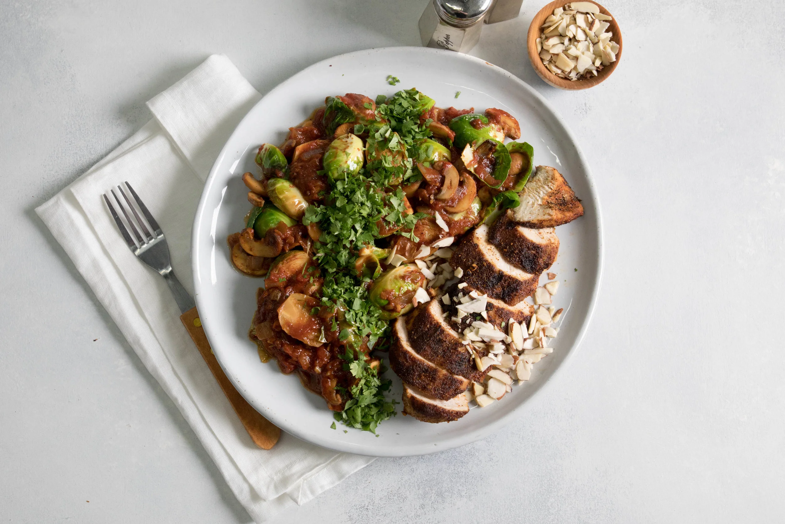Green Chef needed a refresh of its photography style guide. Rustic woods and mismatched props were beginning to take away from the food. To refocus on Green Chef's product, the food, I stripped away any element that might distract from it. White or light grey backgrounds with subtle texture, white or neutral dinnerware, but with a hint of wood to bring in that natural, organic feel.